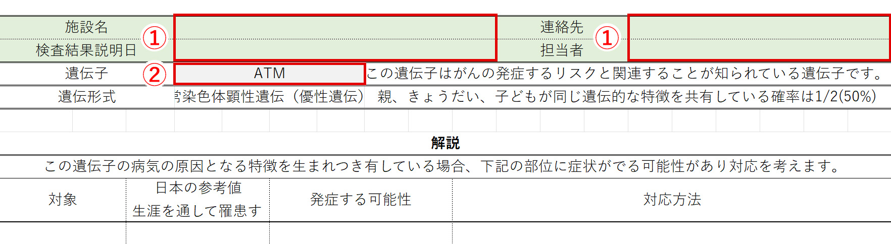 ②説明したい遺伝子名を選択すると、発症しやすい臓器、対応についてシートが更新されます。